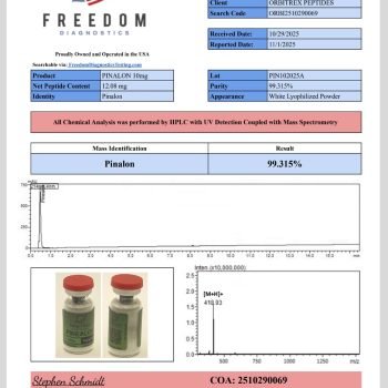 Pinealon is supplied in lyophilized powder form, making it highly stable for long-term storage at -20°C and easy to prepare for research use. Each vial is manufactured to the highest industry standards and verified through 3rd-Party Certificates of Analysis (COAs) to confirm 99%+ purity. This level of transparency and documentation ensures that researchers have complete confidence in the quality and consistency of every batch.