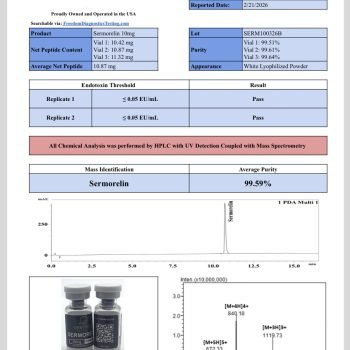 Manufactured under strict quality controls, Sermorelin 10mg is supplied in lyophilized powder form, ensuring stability and maintaining potency when stored under recommended conditions (-20°C). Every vial is backed by 3rd-Party Certificates of Analysis (COAs), verifying 99%+ purity, so researchers can work with confidence knowing they have a product that meets rigorous scientific standards.