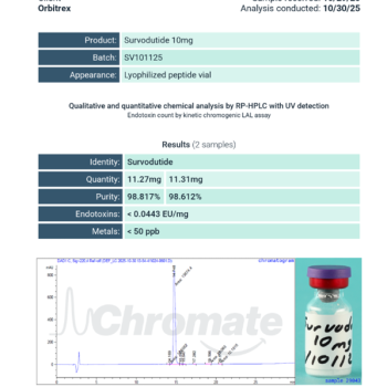 At Orbitrex Peptides, we believe that research deserves the very best tools, which is why we dedicate ourselves to producing peptides that embody precision, purity, and trust. Our Survodutide is specifically designed with this vision in mind, offering researchers and professionals a solution that is not only highly effective but also supported by the rigorous standards our brand is known for.