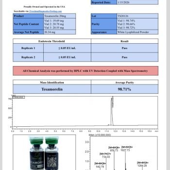 Every vial of Tesa-20mg is backed by 3rd-party Certificates of Analysis (COAs) that confirm 99%+ purity, accurate net content and free of impurities, giving researchers confidence in the accuracy of their work.